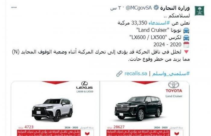 ويشمل الاستدعاء 28,627 سيارة تويوتا لاندكروزر موديل 2020-2024، و4,723 سيارة لكزس LX600 & LX500 موديل 2020-2024.