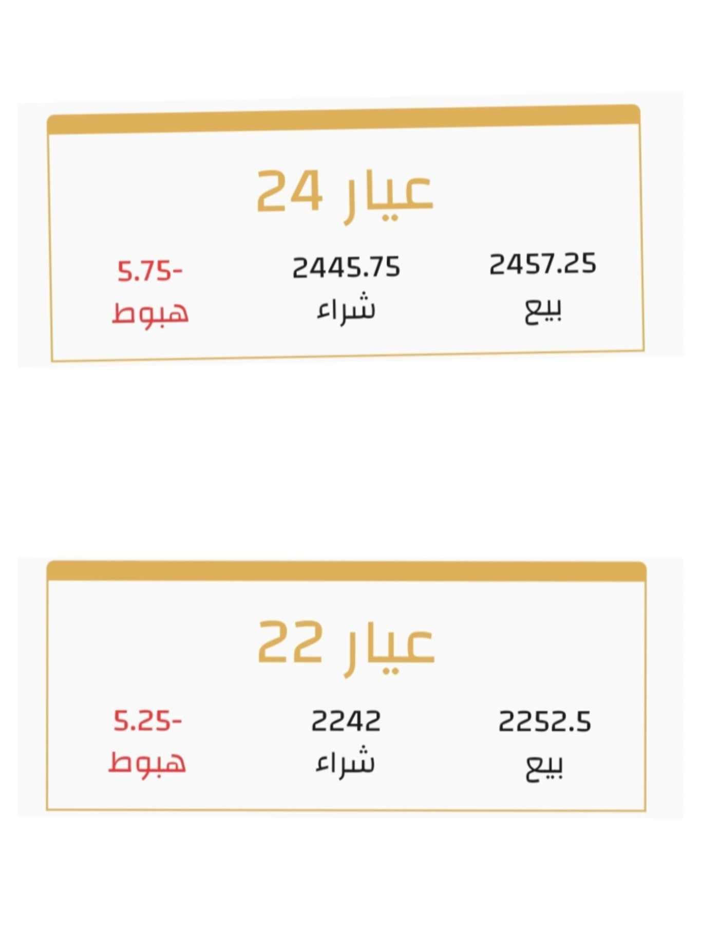 سجل سعر الذهب عيار 24 اليوم الثلاثاء 3 أكتوبر في الأسواق المصرية 2457 جنيهًا للبيع و2245 جنيهًا للشراء. وبهذا يكون سجل انخفاضًا في سعره بـ 5 جنيهات و75 قرشًا.
