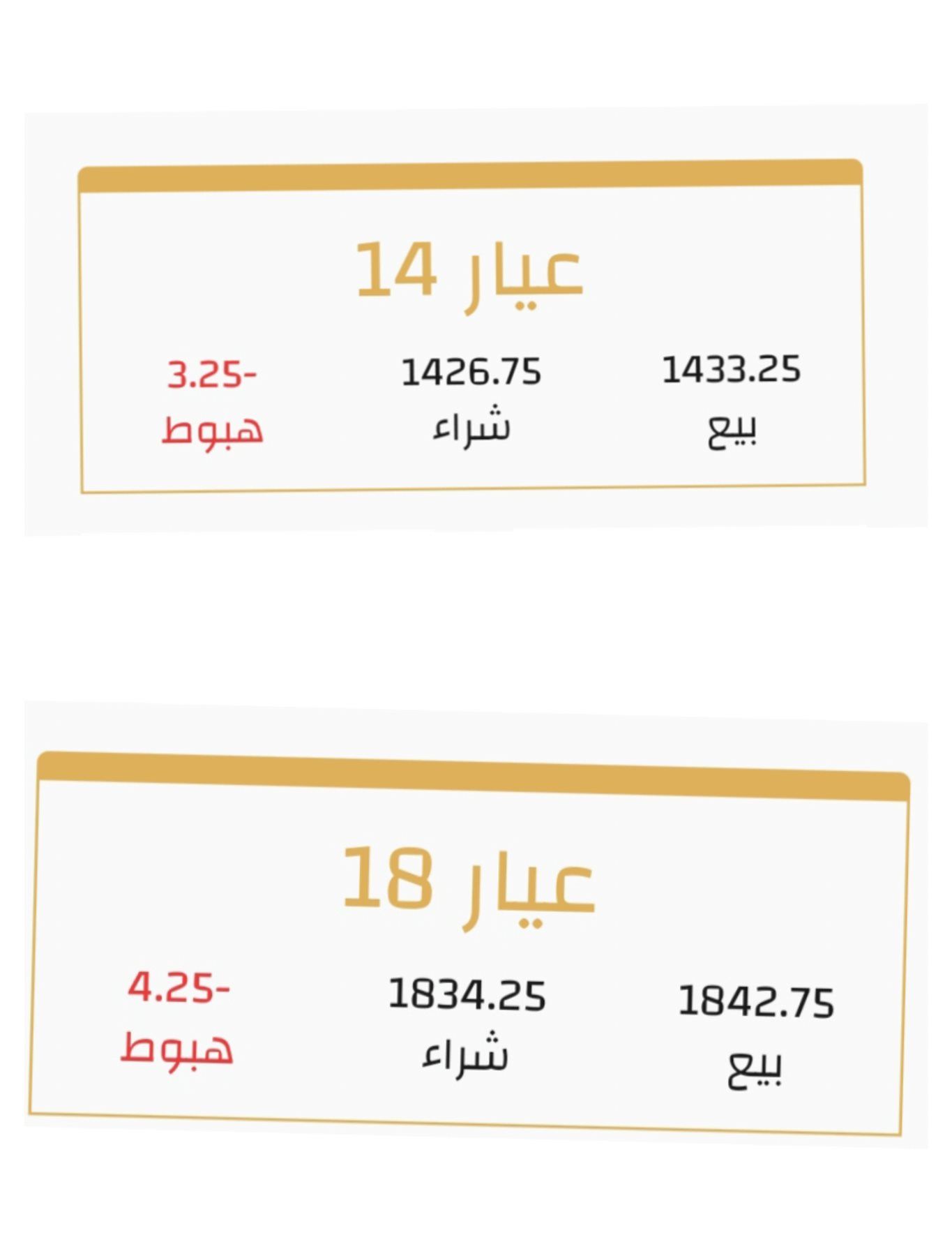 وسجل سعر الذهب عيار 14 اليوم الثلاثاء 3 أكتوبر في الأسواق المصرية 1433 جنيهًا للبيع و1426 جنيهًا للشراء. وبهذا يكون سجل انخفاضًا في سعره بـ 3 جنيهات و25 قرشًا.