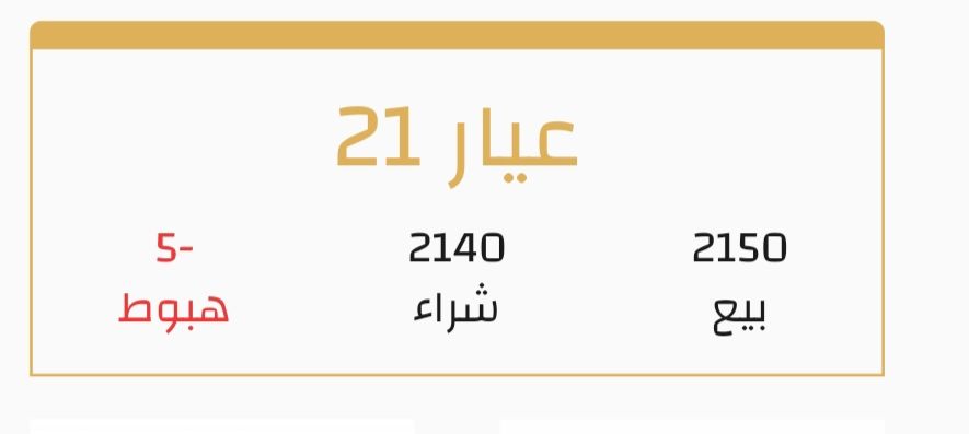 سجل سعر الذهب اليوم الثلاثاء 3 أكتوبر في الأسواق المصرية 2150 جنيهًا للبيع و2140 جنيهًا للشراء. وبهذا يكون سجل انخفاضًا في سعره بـ 5 جنيهات.
