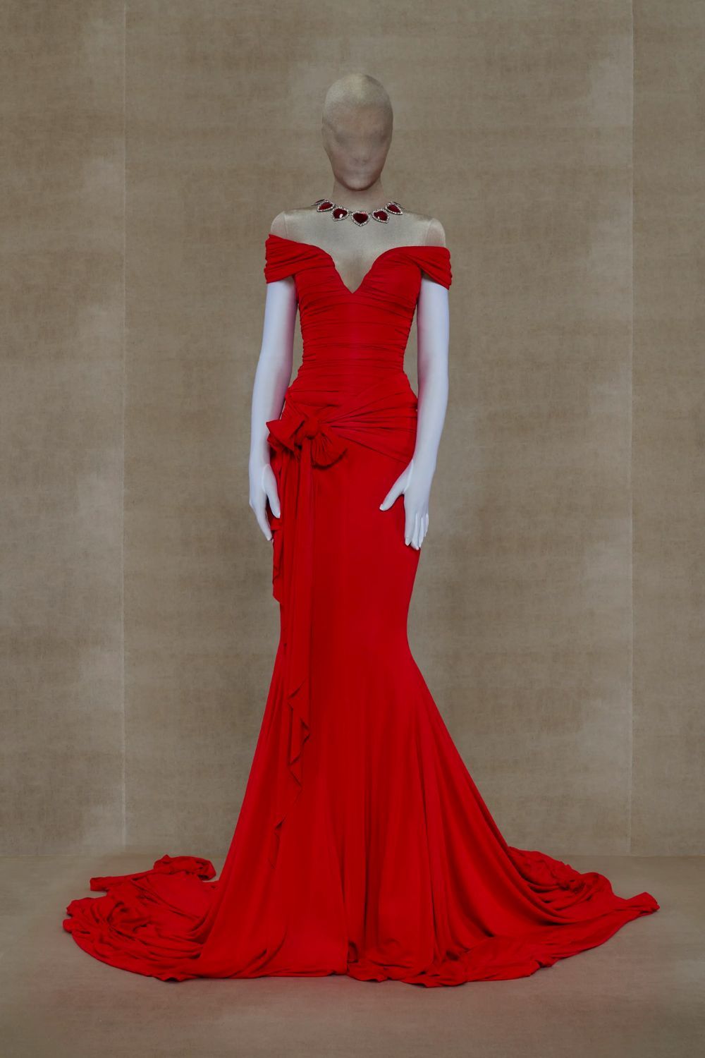 واختارت جورجينا رودريجيز، فستانا أحمر اللون من ماركة vetements، زينته بعقدين من الماس يتدلي من أحدهما حجر أحمر ضخم، فيما تركت شعرها منسدلا علي كتفها.