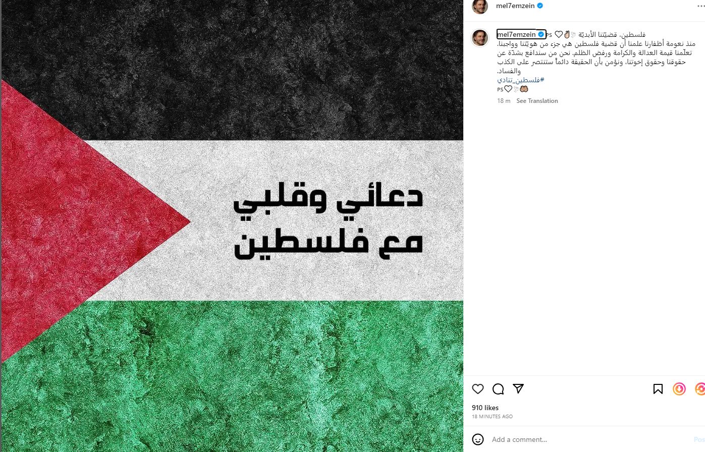 ونشر المطرب اللبناني ملحم زين، عبر حسابه الشخصي على موقع تبادل الصور والفيديوهات إنستجرام، صورة لعلم فلسطين، وعلق عليها: فلسطين، قضيّتنا الأبديّة، منذ نعومة أظفارنا علمنا أن قضية فلسطين هي جزء من هويّتنا وواجبنا.