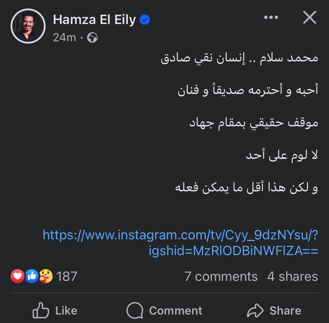 وشارك الفنان حمزة العيلي منشورا يدعم فيه الفنان محمد سلام، وذلك عبر حسابه الرسمي على موقع التواصل الاجتماعي فيسبوك.