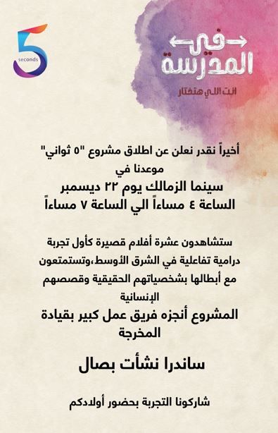 كشفت شركة 5 ساكند عن انطلاق مشروع "5 ثوانى" وعروض أفلام قصيرة بعنوان "في المدرسة.. انت اللى هتختار"، وذلك يوم الجمعة المقبل بسينما الزمالك الساعة 4 عصرا، وتأتي تلك الأفلام بقيادة المخرجة ساندرا نشأت.