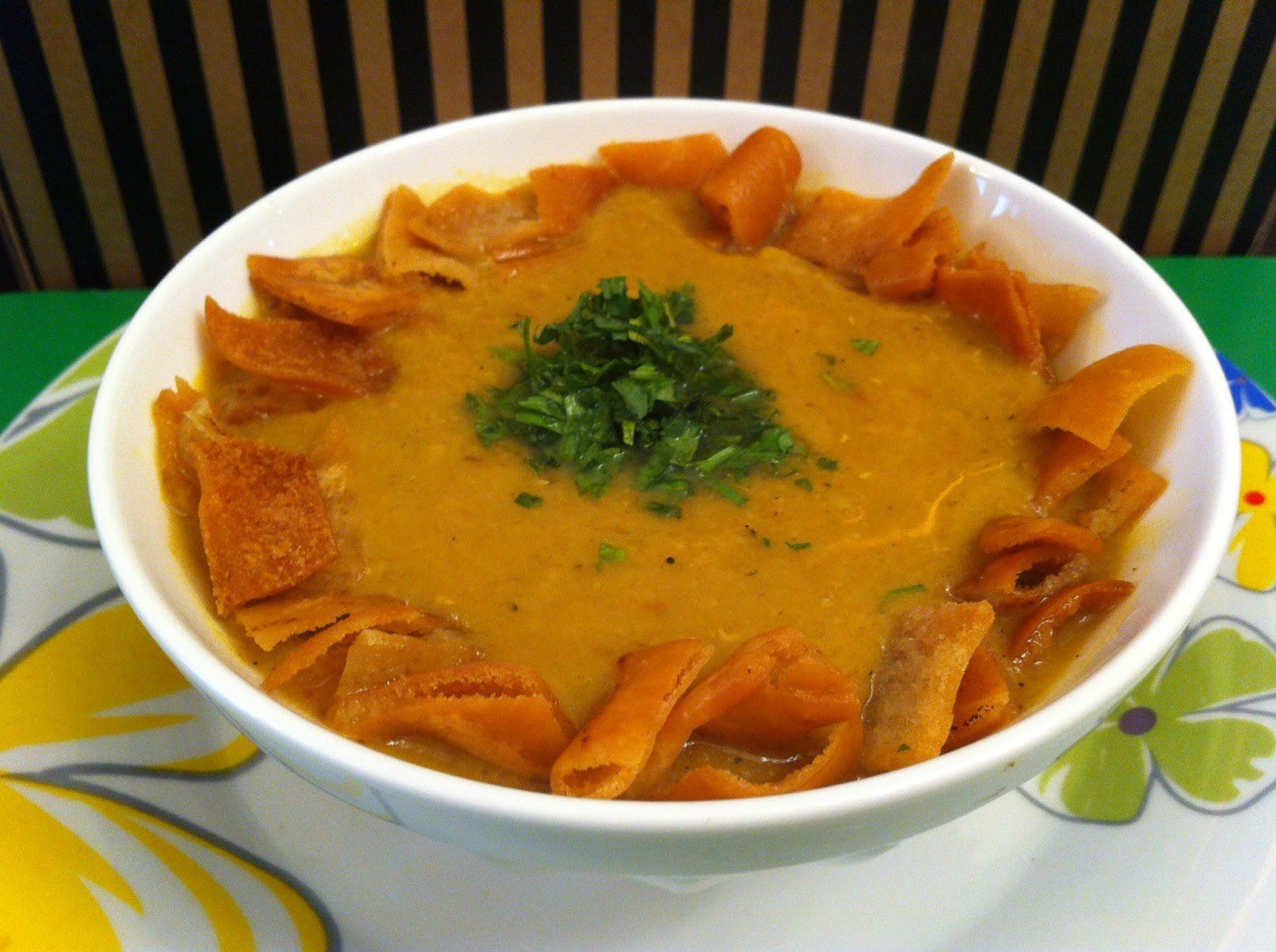 عند التقديم تجمل بالكسبرة الخضرا وقطع الخبز المحمص.