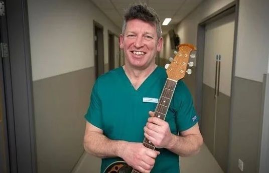 يلجأ توم أوين طبيب وحدة العناية المركزة بمستشفى رويال بريستون البريطاني إلى زرع الابتسامة على وجه المرضى من خلال عزفه على الغيتار.