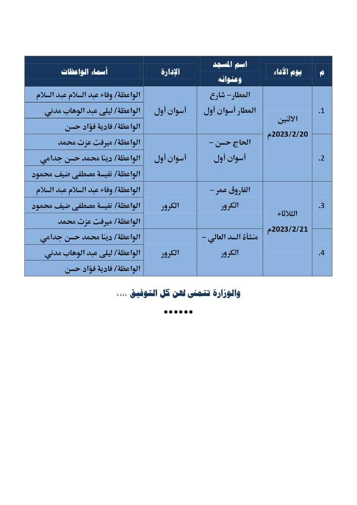 أعلنت وزارة الأوقاف انطلاق القافلة الدعوية للواعظات إلى أسوان وذلك يومي الإثنين والثلاثاء القادمين الموافق 20، 21/2 /2023م بعد صلاة العصر.