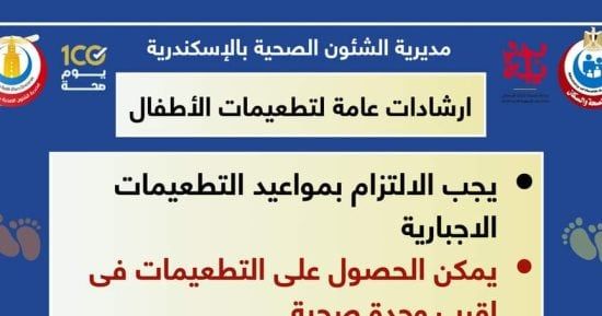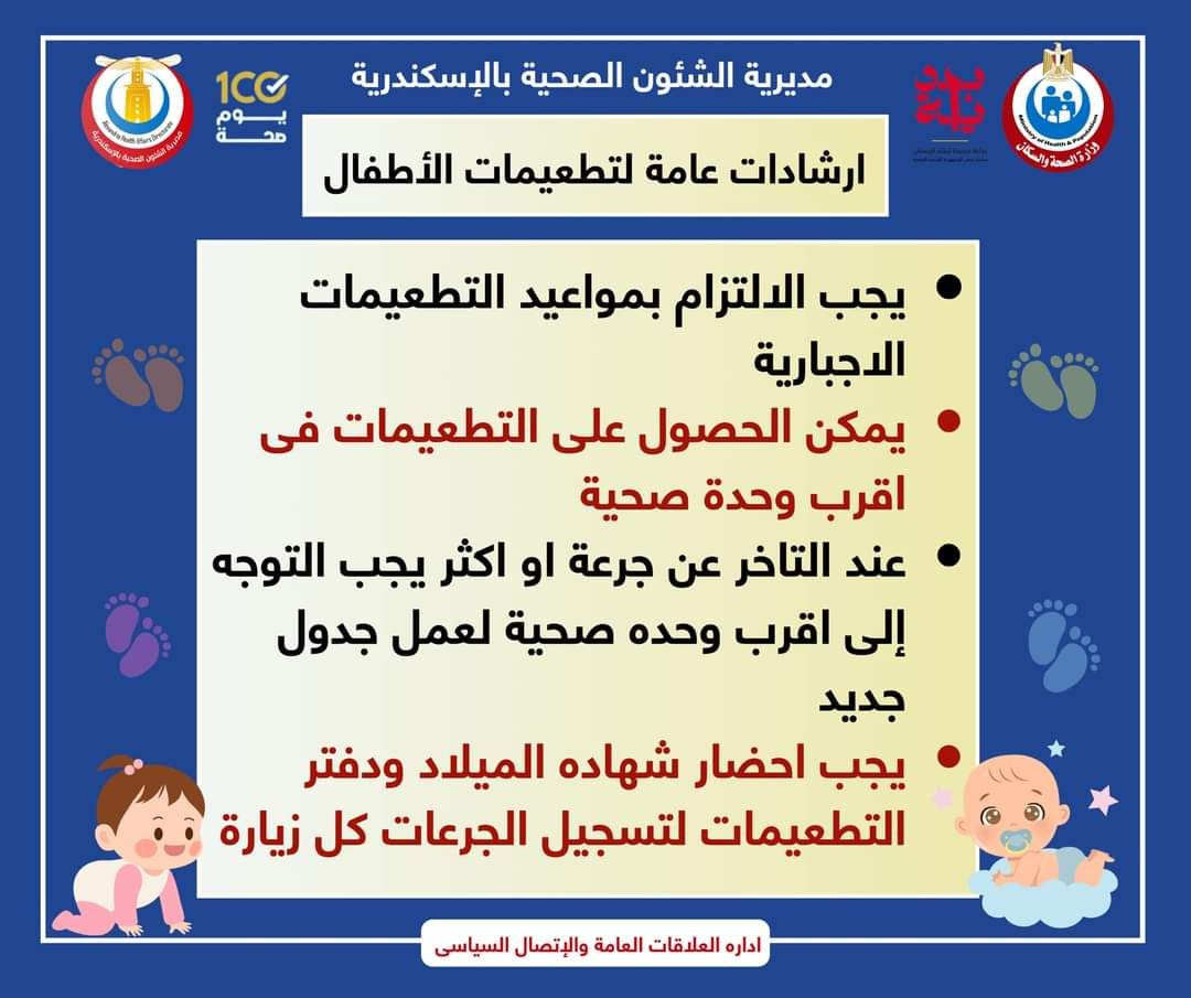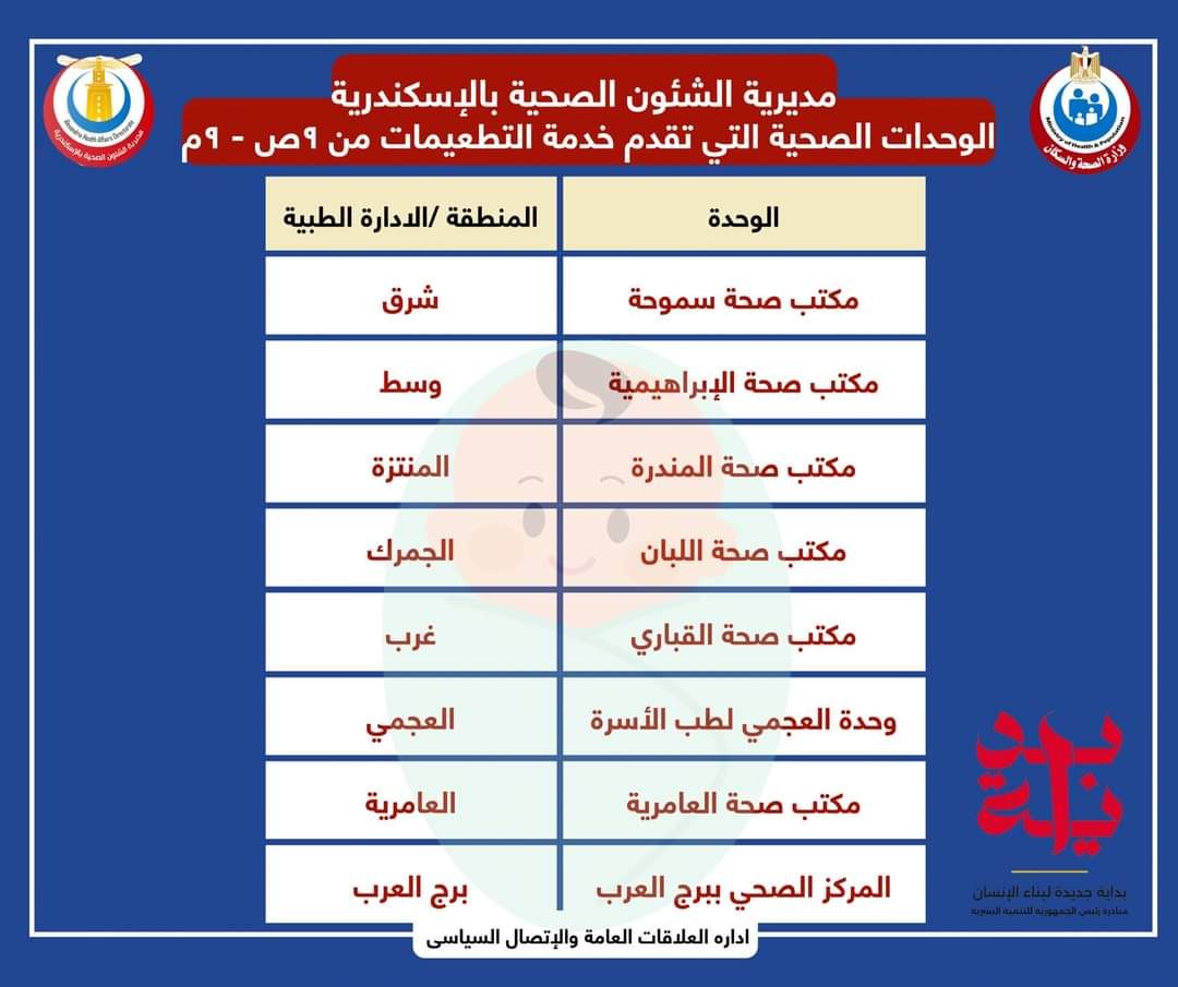 أعلنت مديرية الصحة بالإسكندرية أماكن مواعيد التطعيمات الروتينية بجميع الوحدات الصحية يوميًا من الساعة 8 صباحًا حتى الساعة 2 ظهرًا ماعدا الجمعة والإجازات الرسمية، بالإضافة لوحدة صحية واحدة بكل منطقة وإدارة طبية من الساعه 9 صباحًا و حتى الـ9 مساءً، والجرعة الصفرية والكبدى عند الميلاد يوميًا من الساعة 8 ص حتى الساعة 6 مساءً يوميًا بما فى ذلك أيام الجمعة والإجازات الرسمية.