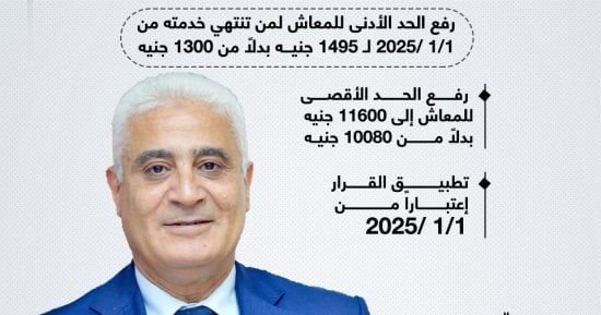 التأمينات تعلن زيادة الحد الأدنى للمعاش لـ 1500 جنيه والأقصى 11600 جنيه