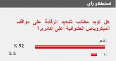 فى استطلاع للرأى طرحه "اليوم السابع" على قرائه الأعزاء تحت عنوان هل تؤيد مطالب تشديد الرقابة على مواقف الميكروباص العشوائية أعلى الدائرى؟، أيد غالبية القراء تكثيف مطالب تشديد الرقابة على مواقف الميكروباص العشوائية أعلى الدائرى.