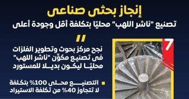 وأوضح الدكتور نادر الباجورى أنه تم إنتاج "ناشر اللهب" في المسبك التجريبي بنسبة تصنيع محلي 100% لإحدى محطات الكهرباء بجمهورية مصر العربية، حيث تم توفير ما يقارب 60% من قيمة المنتج المستورد، وتم إنتاجه محليًا بتكلفة لا تتجاوز 40% من تكلفة الاستيراد.