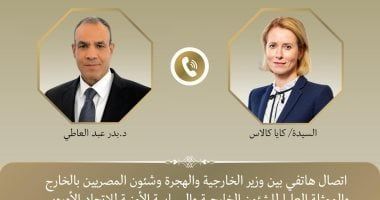 تلقى د. بدر عبد العاطي وزير الخارجية والهجرة وشئون المصرين بالخارج اتصالًا هاتفيا من "كايا كالاس" الممثلة العليا للشئون الخارجية والسياسة الأمنية للاتحاد الأوروبي يوم الجمعة ٧ نوفمبر لبحث الشراكة الثنائية بين مصر والاتحاد الأوروبي، والتطورات الإقليمية والدولية ذات الاهتمام المشترك.