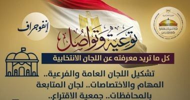 الأحد، 09 نوفمبر 2025 01:44 ماستمرارًا لحملة توعية وتواصل التي بدأتها وزارة الشؤون النيابية والقانونية والتواصل السياسي، بالتزامن مع انتخابات مجلس النواب، نشرت اليوم الأحد، إنفوجرافات توعية تتعلق باللجان الانتخابية، وكل الأسئلة حولها، بعنوان (توعية وتواصل.. كل ما تريد معرفته عن اللجان الانتخابية.. تشكيل اللجان العامة والفرعية.. المهام والاختصاصات.. لجان المتابعة بالمحافظات.. جمعية الاقتراع).