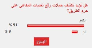 وأيد 91% من القراء مطالب تكثيف حملات رفع تعديات المقاهى على حرم الطريق، بينما رفض 9% مطالب تكثيف حملات رفع تعديات المقاهى على حرم الطريق.