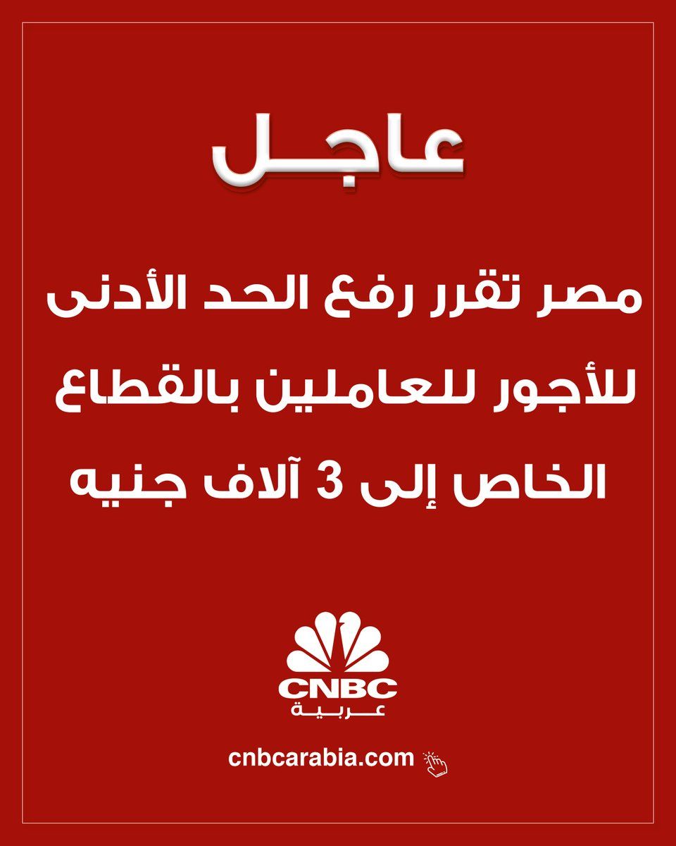 قناة CNBC عربية | #عاجل | المجلس القومي للأجور في #مصر يقرر رفع الحد الأدنى للأجور للعاملين بالقطاع الخاص من 2700 إلى 3000 جنيه بداية من يوليو القادم #cnbcعربية #اقتصاد_CNBCعربية #اقتصاد