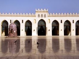 3- أما عن تخطيط المسجد فهو مستطيل الشكل، ويتكون من صحن أوسط مكشوف تحيطه أربع أروقة ويعلو واجهته مئذنتين، وقد تعرض المسجد للعديد من عمليات الترميم على مر السنين، كما أن له تاريخًا مثيرًا للاهتمام؛ حيث اتخذته الحملة الفرنسية مقرًا لجنودها واستخدمت مئذنتيه كأبراج للمراقبة، استخدم رواق قبلته كأول متحف إسلامي بالقاهرة أطلق عليه دار الآثار العربية.