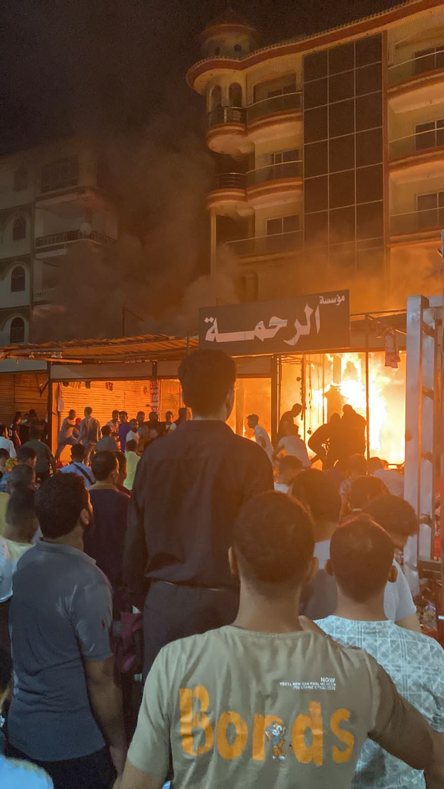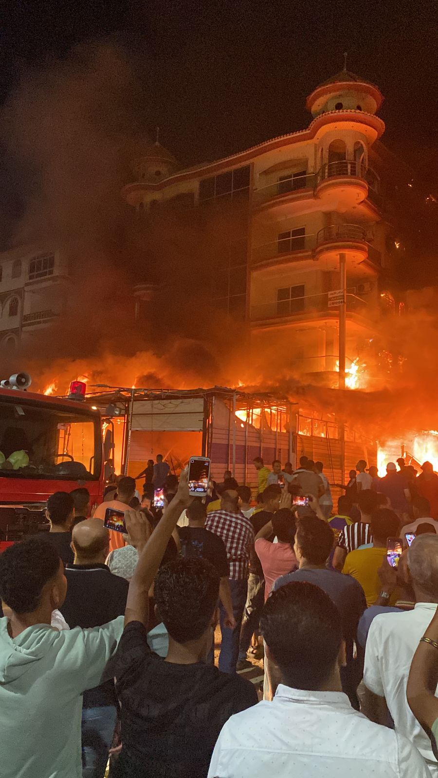 وجار محاولات للسيطرة علي الحريق ولا تزال ألسنة النيران مشتعلة بمنطقة السوق بشارع امون بمدينة جمصة