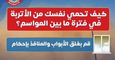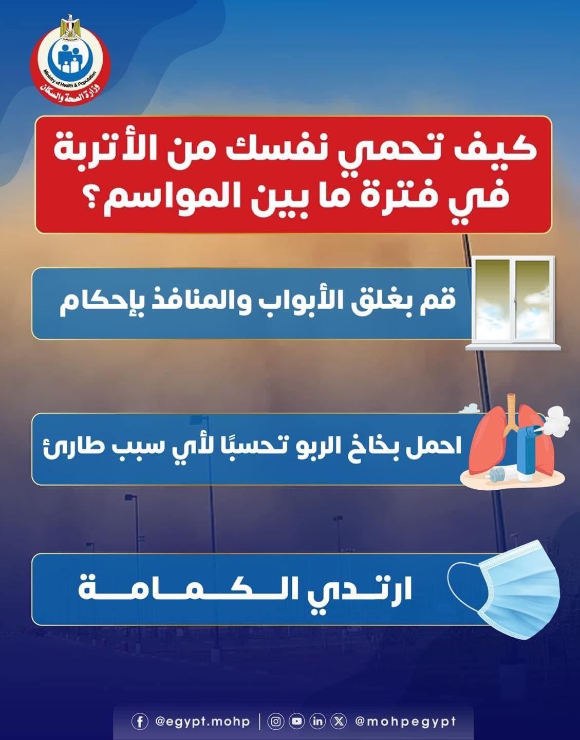 كشفت وزارة الصحة والسكان عن حزمة من النصائح التى يجب اتباعها للحماية من الاتربة ومضاعفاتها فى فترة بين المواسم والتى شملت:-