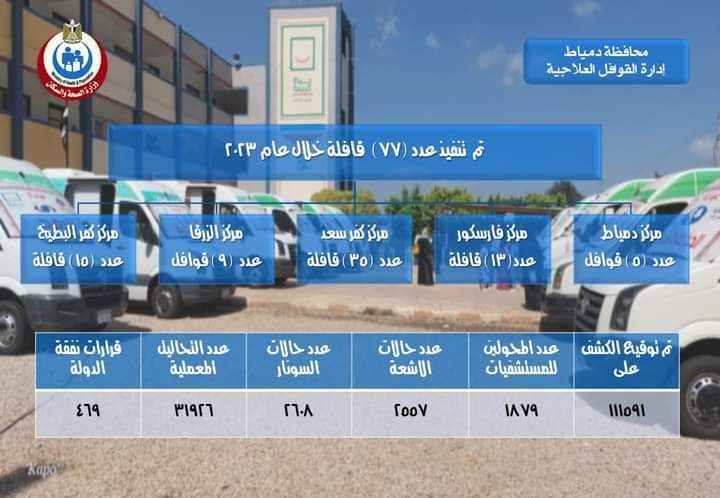 وأشار البيان إلى أنه تم تنفيذ 5 قوافل بمركز دمياط و 13 قافلة بمركز فارسكور، علاوة على تنفيذ 35قافلة بمركز كفر سعد و 9 قوافل بمركز الزرقا و 15 قافلة بمركز كفر البطيخ، تم خلالهم توقيع الكشف الطبى على 111591 مواطن و تحويل 1879 حالة لتلقى العلاج اللازم بالمستشفيات و أيضًا فحص 2557 حالة بالأشعة و 2608 حالة بالسونار وإجراء 31926 تحليل معملى استصدار 469 علاج على نفقة الدولة.