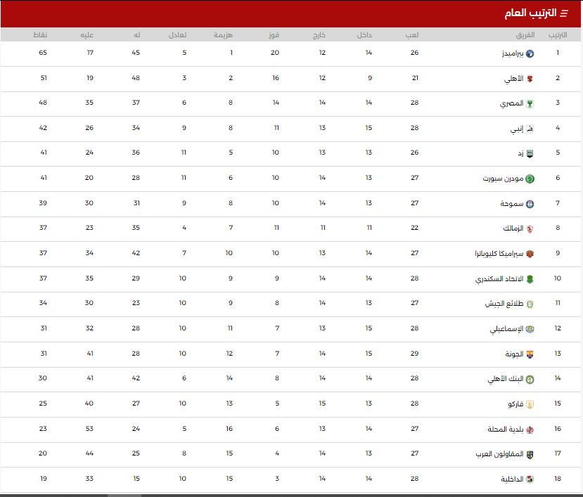 جدول ترتيب الدورى المصرى الممتاز "دورى Nile"