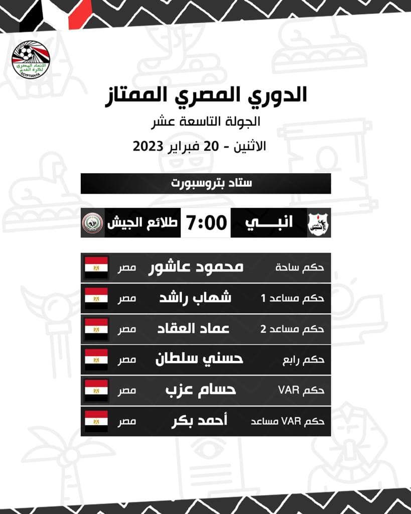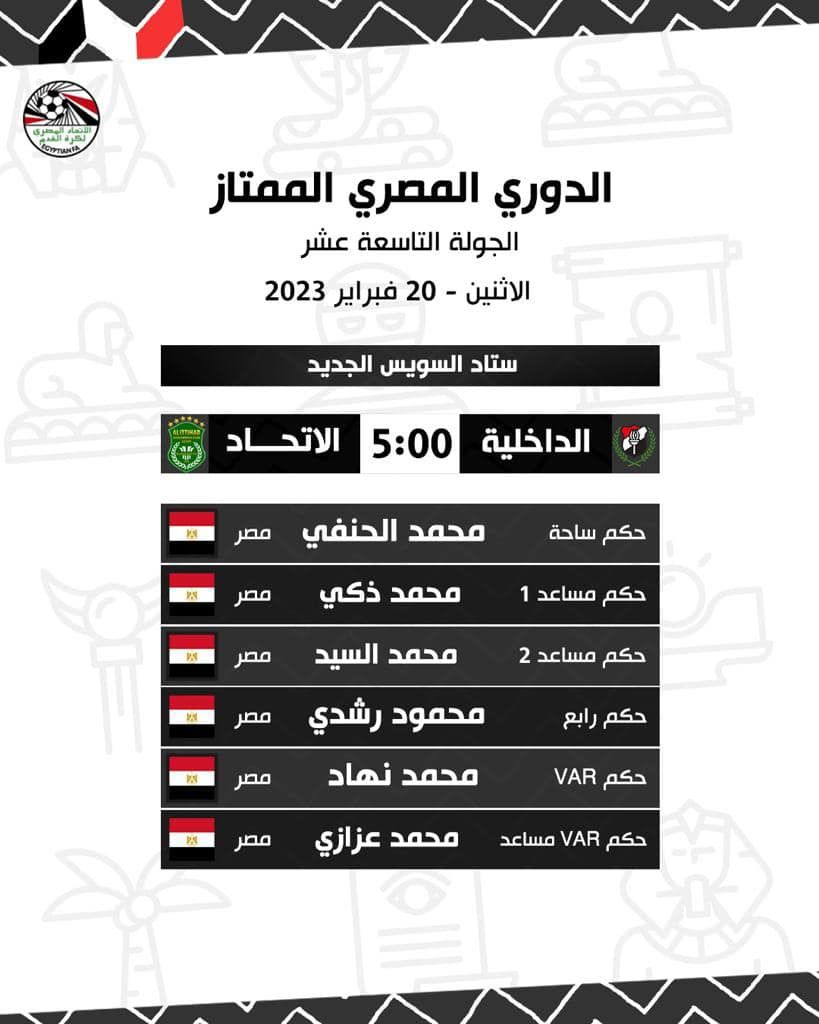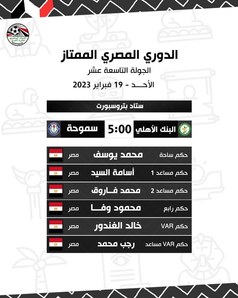الدوري المصري، أعلنت لجنة الحكام الرئيسية بـالاتحاد المصري لكرة القدم، أسماء حكام مباريات الأحد والاثنين، ضمن مواجهات الجولة 19 من مسابقة الدوري المصري الممتاز على النحو التالي: