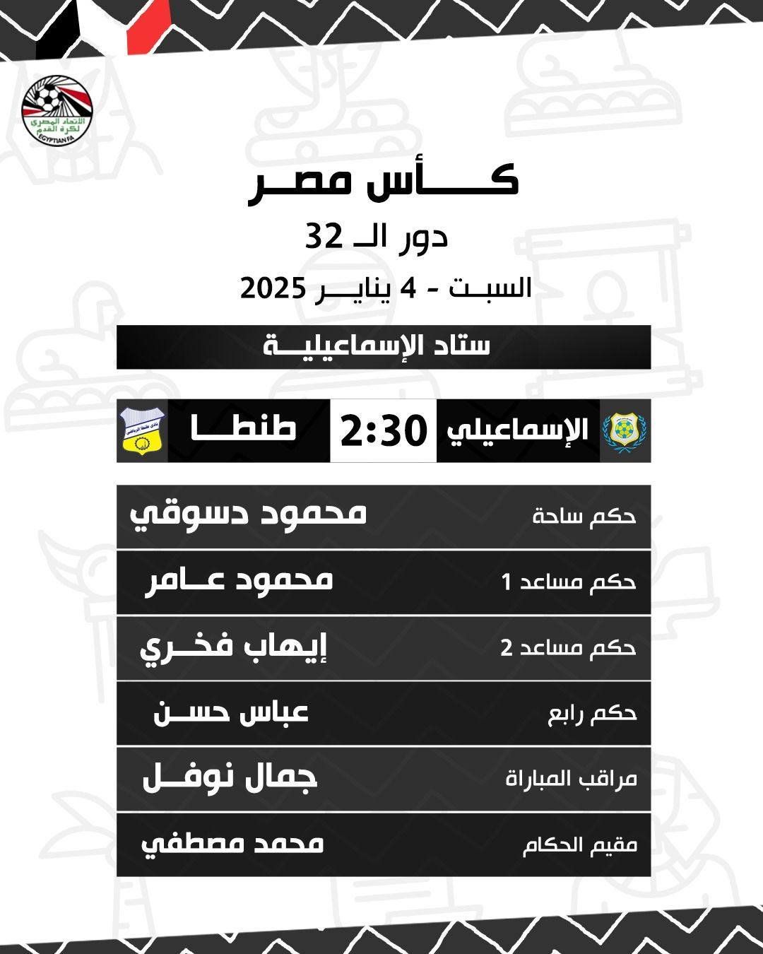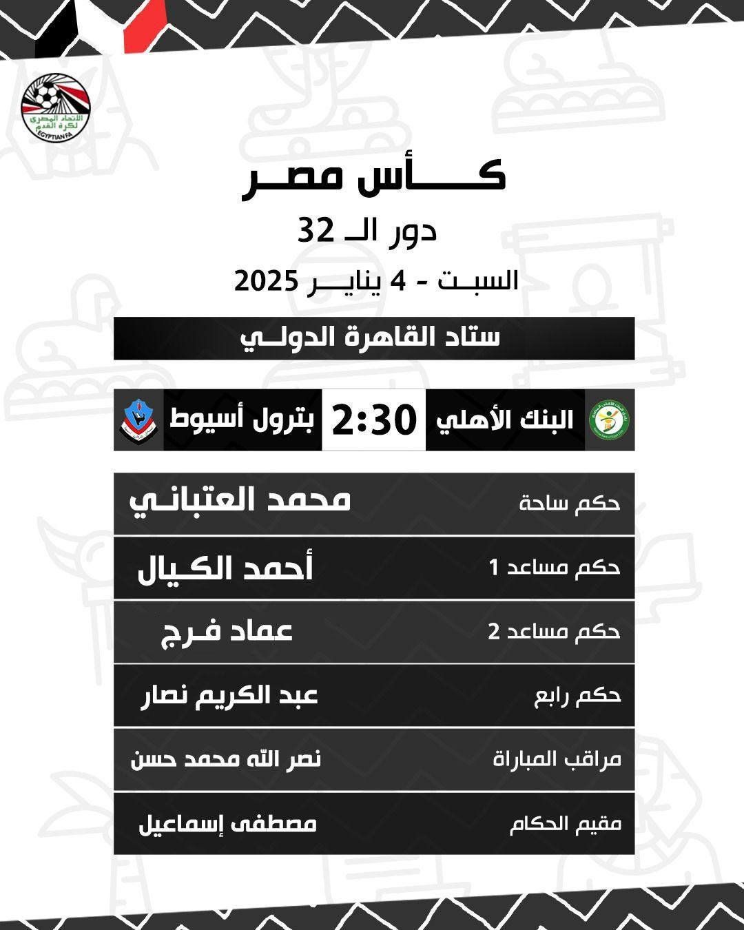 كأس مصر، أعلنت لجنة الحكام الرئيسية باتحاد الكرة، أسماء حكام مباريات اليوم السبت، ضمن مواجهات دور الـ32 من مسابقة كأس مصر للموسم الحالي 2024 - 2025 على النحو التالي: