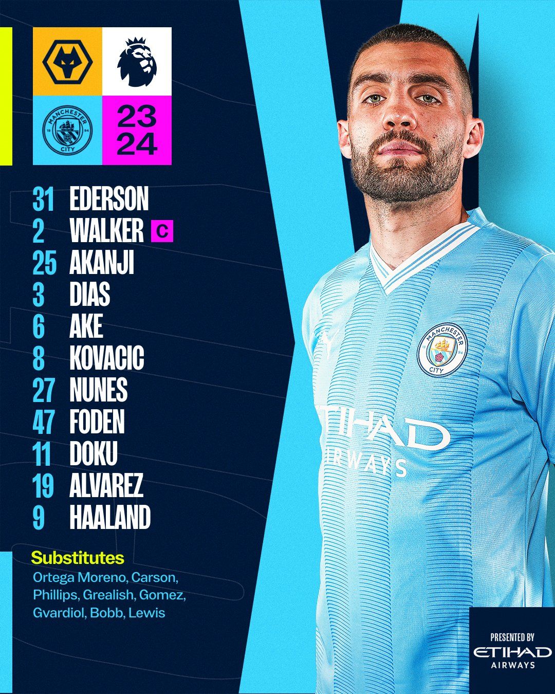 أعلن بيب جوارديولا مدرب مانشستر سيتي، التشكيل الرسمي الذي سيخوض به مباراة وولفرهامبتون المقرر إقامتها الخامسة مساء اليوم السبت، على ملعب "مولينيو"، ضمن منافسات الجولة السابعة من الدوري الإنجليزي الموسم الجاري 2023-2024.