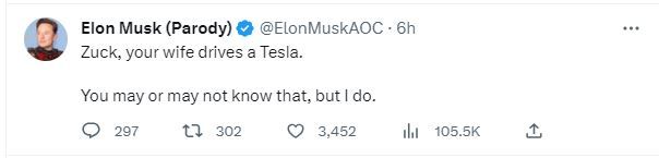 وجاء في تغريدة ماسك: "زوك زوجتك تقود سيارة تسلا، ربما تعرف بذلك وربما لا، ولكن من المؤكد أننى أعلم ذلك جيدا".